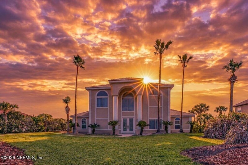 Listing details for 1 San Gabriel Ln, Palm Coast, FL 32137 : EXQUISITE LAKEFRONT OCEAN VIEW residence just steps from the Atlantic Ocean with private beach access. From the moment you enter this custom home, expansive water views create an immediate sense of tranquility, immersing you in the natural beauty of this Audubon-certified coastal sanctuary. On the first level, two spacious guest rooms and two full bathrooms, plus a private den, open to a large family/media room with a custom wet bar, ideal for entertaining in relaxed coastal elegance. Ascend the dramatic staircase to the main living area with stunning ocean and lake views from every room. The great room featuring a cozy fireplace, flows seemlessly into the dining area and gourmet kitchen, designed for the modern chef with granite countertops and generous space for gatherings. The primary suite serves as a serene retreat, offering a spa-inspired bath and peaceful views of the surrounding landscape. Recent renovations have elevated this home to like-new condition. 3 Car garage