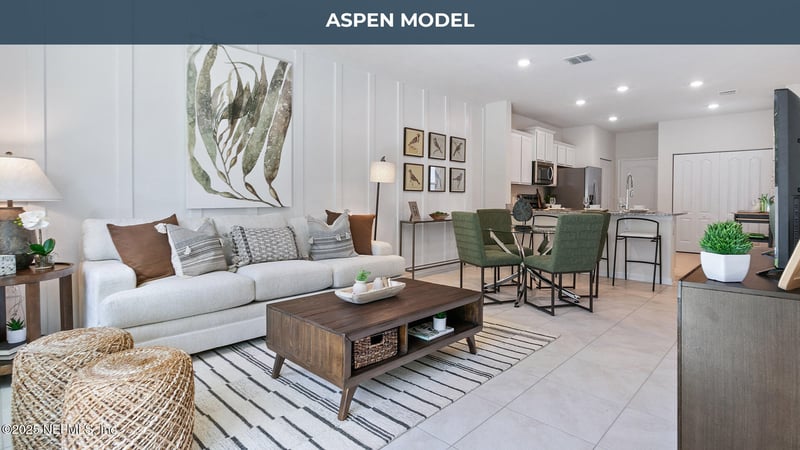 Listing details for 101 Blue Haven Rd, St Augustine, FL 32095 : Welcome home to the Aspen! This Tradition Series townhome offers the perfect combination of efficient design and modern style in a 2-bedroom, 2.5-bathroom townhome with 1,210 square feet of well-planned living space and an attached 1-car garage. Ideal for first-time buyers, downsizers, or anyone seeking low maintenance living without sacrificing comfort, this home checks all the boxes. Step inside and you'll immediately notice the thoughtfully arranged main living area. A spacious kitchen with bar for entertaining has proven to provide plenty of cooking space and room to gather. The kitchen flows into a quaint dining area and inviting living room, creating a welcoming space for family and friends. Oversized sliding glass doors open to a cozy patio, offering a breezy outdoor escape to unwind and soak up the Florida sunshine. Upstairs, two generously sized bedrooms each have their own private bathrooms, making this plan a great fit for a roommate setup, guests, or a home office.