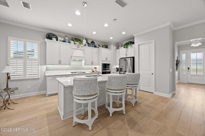 Listing details for 102 Fawn Field Ln, St Augustine, FL 32092 : PRICE IMPROVEMENT Move-in ready, upgraded home with 3 car garage, LOW HOA($131/Mo) & NO CDD—enjoy all the benefits of a new home without the wait! Luxury living in this beautifully upgraded Riverside-built home. Pet-Free, Carpet-Free & Ready for a Quick Close! Neutral palette throughout. Located on one of Silverleaf's premium water-view lots. From the moment you arrive, the long paver driveway, landscaped yard and charming front porch overlooking the green space set an inviting tone. Step inside to an open, airy floor plan featuring engineered hardwood floors throughout—10-foot ceilings, crown molding, wainscoting, plantation shutters, upgraded lighting and elegant designer touches at every turn. The gourmet kitchen is a showstopper, offering a large quartz island, soft-close cabinetry with under-cabinet lighting, stylish glass backsplash and wooden-shelved walk-in pantry. The kitchen opens seamlessly to a spacious living room with tray ceiling, shiplap accent wall and beautiful views of the backyard and pond. The extended primary suite is a peaceful retreat w walls of windows overlooking the water, dual walk-in closets, and a spa-like bath featuring a frameless glass shower, quartz dual-sink vanity, and separate soaking tub. Step through the tall, triple sliders to your private outdoor oasis: a 17x17 screened paver lanai with panoramic screens, pre-plumbed for a summer kitchen, and a spacious backyard perfect for relaxing, entertaining, or letting pets play. Additional features include an insulated 3-car tandem garage with epoxy floors, green energy-reflective radiant barrier added to roof (designed to repel heat & protect shingles), a whole-house surge protector, water softener, outdoor receptacle for landscape lighting, gas line for future outdoor patio and full-house gutters. All of this is just a short walk to Silverleaf's resort-style amenity center complete with 3 Olympic-sized pools, splash pad, dog park, pickleball courts, playground, sports field, and more! Top-rated schools! Community contains shopping, dining, and upcoming hospital. Convenient access to historic downtown St. Augustine, and Jacksonville airport.