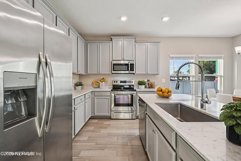 Listing details for 10206 Lebron Ct, Jacksonville, FL 32218 : Well-maintained home offering approximately 1,750 square feet with 3 spacious bedrooms, 2 full bathrooms, and an additional flex room ideal for a home office, playroom, or extra living space. Built in September 2021, this home feels modern, fresh, and truly move-in ready. Situated on a desirable corner lot, the fully fenced backyard provides privacy and plenty of space for outdoor entertaining, pets, gardening, or relaxing. Inside, you'll find a dedicated laundry room complete with washer, dryer, and an upgraded utility sink. The owner's suite features a large walk-in closet, dual vanities, a soaking tub, and a separate walk-in shower. Notable upgrades include wood-look tile throughout the main living areas, a neutral color palette, quartz countertops, stainless steel appliances, and a full-house water softener. Additional highlights include a paved driveway and a covered, screened lanai for comfortable outdoor living.