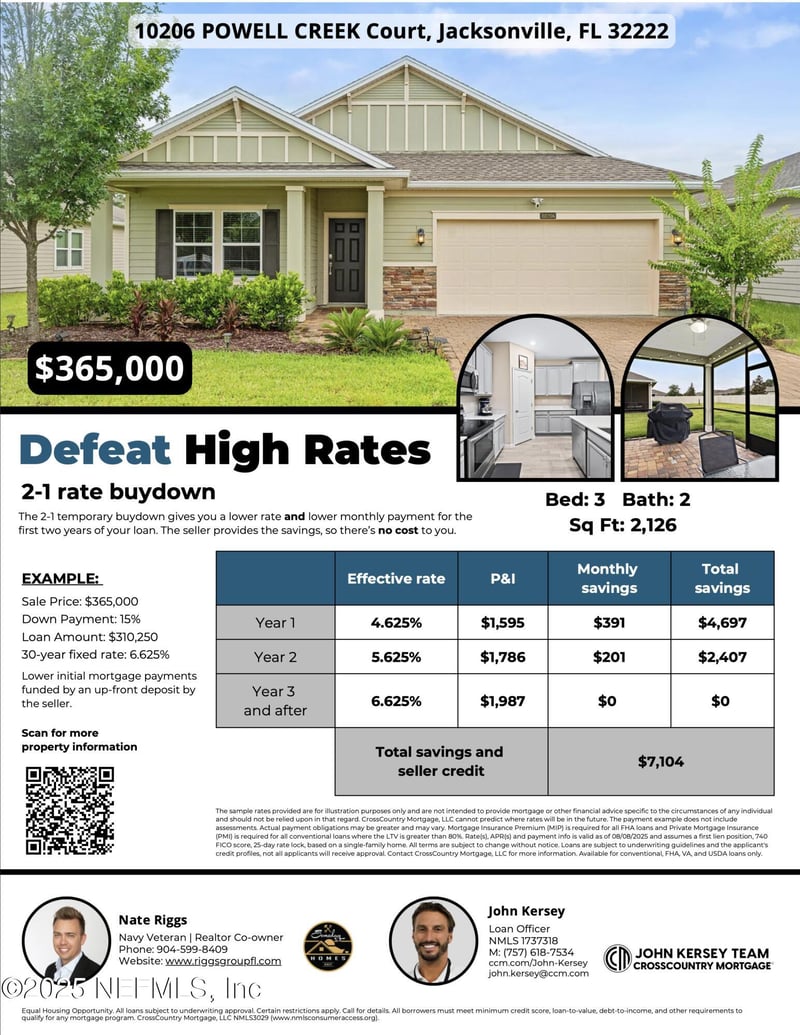 Listing details for 10206 Powell Creek Ct, Jacksonville, FL 32222 : **Back on your radar with new pricing and unbeatable buyer incentives!** Built in 2019, this 3 bed, 2 bath home features a 2-car garage, paver driveway, and charming front porch. Inside, you'll find an open layout with multiple living areas, a front flex room perfect for an office or playroom, and a private wing with two bedrooms, a full bath, and its own living space. The kitchen has modern finishes and plenty of storage, and the laundry room includes custom built-ins and an accent wall. The primary suite offers a walk-in closet, dual sinks, walk-in shower, and garden tub. Out back, enjoy a screened paver lanai and large yard. Seller-funded rate buydown options and a 2.25% assumable VA loan make this an incredible value. Neighborhood amenities include a pool, fitness center, walking trails, and event spaces. Conveniently located near River City Marketplace, JAX airport, and I-295. Don't miss this move-in ready gem.