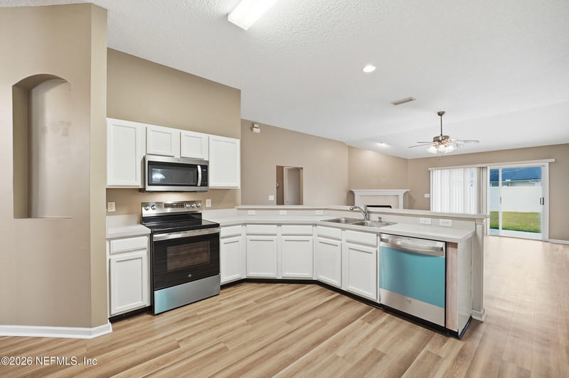 Listing details for 1109 Seattle Slew Ln, Jacksonville, FL 32218 : Located on a corner lot in sought-after Saddlewood, where seasonal flags along the main road add a festive welcome home. This beautiful brick home features a 2-car attached garage, an open and airy floor plan, updated flooring, brand-new appliances, a split-bedroom layout, and a versatile flex space ideal for a home office! FULL DETAILS: Offering 3 bedrooms, 2 full baths, a versatile flex room, and a cozy family room with a fireplace, this home delivers the perfect balance of comfort and convenience. The open kitchen feels welcoming with a breakfast bar, cozy eat-in nook, and all-new appliances recently installed. A split layout keeps the owner's suite private, while two additional bedrooms and a shared bath sit on the opposite side of the home. A formal dining room, interior laundry, and two-car garage make everyday living comfortable and functional. ROOF REPLACED MAY 2019 | WATER HEATER REPLACED MAY 2025. Perfectly located just 5 minutes from River City Marketplace, UF North Hospital, VA Clinic, and the new Culver's restaurant, this home puts you close to everything!