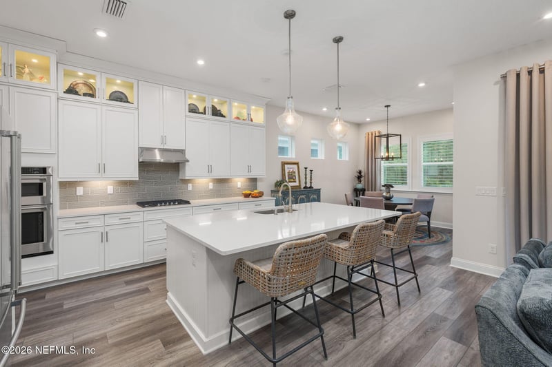 Listing details for 116 Ladyslipper Dr, St Johns, FL 32259 : Wake up to preserve views, quiet privacy, and an oasis backyard, all in WaterSong at RiverTown's gated 55 plus community. This 2022 Pier model is designed for easy living with luxury vinyl plank flooring throughout the main areas and bedrooms, custom wood plantation shutters, recessed lighting, remote controlled ceiling fans, and a flex room/den behind French doors that works perfectly as an office, hobby room, or guest retreat. Both baths are beautifully finished with white quartz countertops, circular framed mirrors, custom textured brick style backsplash accents, and rich stained cabinetry, plus zero entry showers in both the secondary and primary, with the primary featuring marble look tile, and a generous walk-in closet with luggage racks. The kitchen is bright, clean, and ready for company with white quartz counters, double stack white cabinetry with brushed nickel hardware and glass display uppers with lights, a spacious island with seeded glass pendant lights, a pantry closet and stainless appliances including a gas cooktop with hood, 30" wall oven + microwave, and dishwasher. The dining area's industrial farmhouse chandelier adds just the right edge. Outside is where this home goes from nice to wow. Professional, lush, colorful landscaping surrounds two extended paver patios with seating walls, planter beds, and paver walkways that create a true courtyard vibe. The screened lanai with motorized drop down shades and summer kitchen with grill, sink, and refrigerator make entertaining effortless, with plenty of space for guests to mingle, lounge, and stay awhile. Add a fully fenced yard, water softener, EV car charger outlet, whole house gutters, and a tankless water heater, and you have a home that looks good, lives easy, and feels like your own private oasis. Watersong residents enjoy two private amenity centers with resort pool, lap pool, outdoor spa, firepit, pickleball and bocce courts, two fitness centers, event lawn, paw park, lake pavilion, biergarten, and a full calendar of community events.