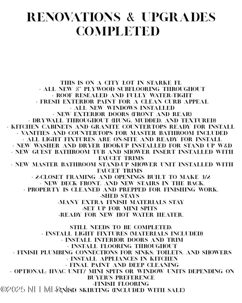 Listing details for 1193 Crum St, Starke, FL 32091 : INVESTORS looking for a home that has all the big work done? Come take a look at this home that needs interior finished and would make a great rental home or sell it. Buyers looking for a home cheaper than rent and be able to finish the way you want. This is for you. Cash only offers for this one. See photos for a list of improvements already done.