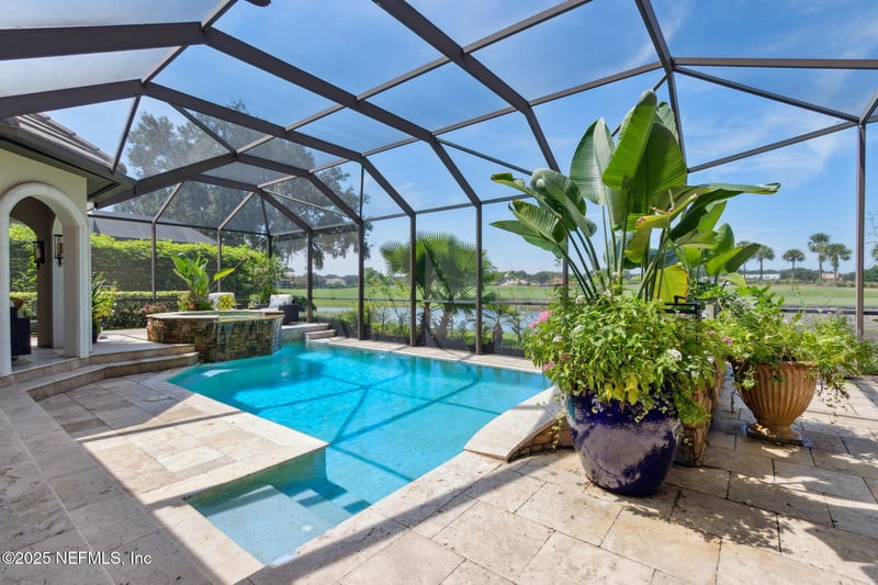 Listing details for 120 Regents Pl, Ponte Vedra Beach, FL 32082 : Reduced from $4.1M. Welcome to The Plantation, where refined luxury meets coastal elegance and residents enjoy an unparalleled lifestyle. Nestled on a cul-de-sac with one of the finest water-to-golf lots overlooking the 9th green, this custom home blends function, comfort, & breathtaking views. With concrete foundation & impact windows, quality is evident throughout. Inside, custom touches & fine finishes reveal meticulous design. Retractable corner sliders open the living space to a screened lanai, pool, & expansive vistas. The gourmet kitchen features top-tier appliances, ample counter space, & views of the pool & golf course. The main-level primary suite offers new hardwood floors, a spa-like bath & lanai access, creating a true retreat. Adjacent office with custom built-ins & opposite-wing ensuite guest room complete the first floor. Upstairs are 2 additional bedrooms, a bonus room with wet bar & flex space. Oversized 3-car garage with tons of storage complete this luxury home.