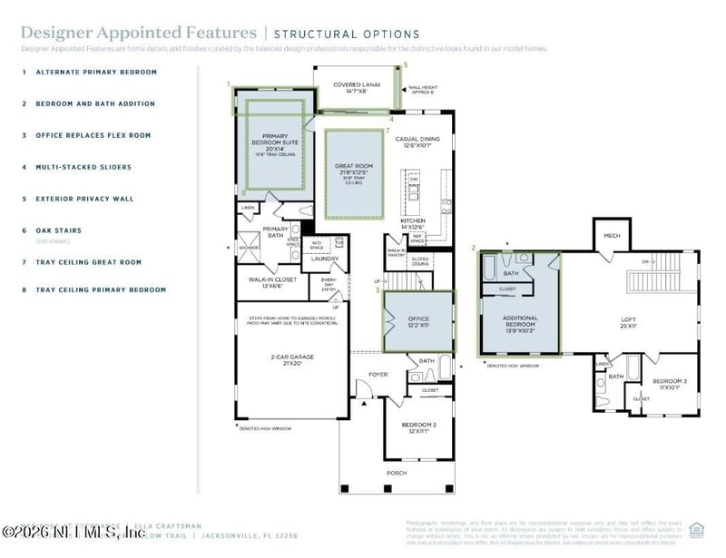 Listing details for 12025 Oak Hollow Trl, Jacksonville, FL 32256 : The Ella home design offers beautiful, functional living on a desirable waterfront homesite, delivering serene views and a peaceful backdrop. A welcoming foyer opens to a bright, open-concept main living area that seamlessly connects the elegant great room, kitchen, and casual dining space--perfect for entertaining. The kitchen features a large center island with breakfast bar, wraparound cabinetry, and a walk-in pantry. A covered lanai extends the living space outdoors, ideal for relaxing or enjoying waterfront sunsets. The first-floor primary suite provides a private retreat with a walk-in closet and a luxurious bath featuring dual vanities, a spacious shower, linen storage, and a private water closet. A secondary bedroom and full bath are also located on the main level. Upstairs, a versatile loft, additional bedroom, and full bath offer flexible living. A flex room, everyday entry, and two-car garage complete this exceptional home.