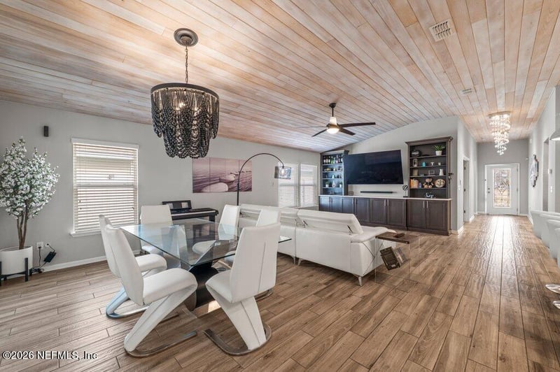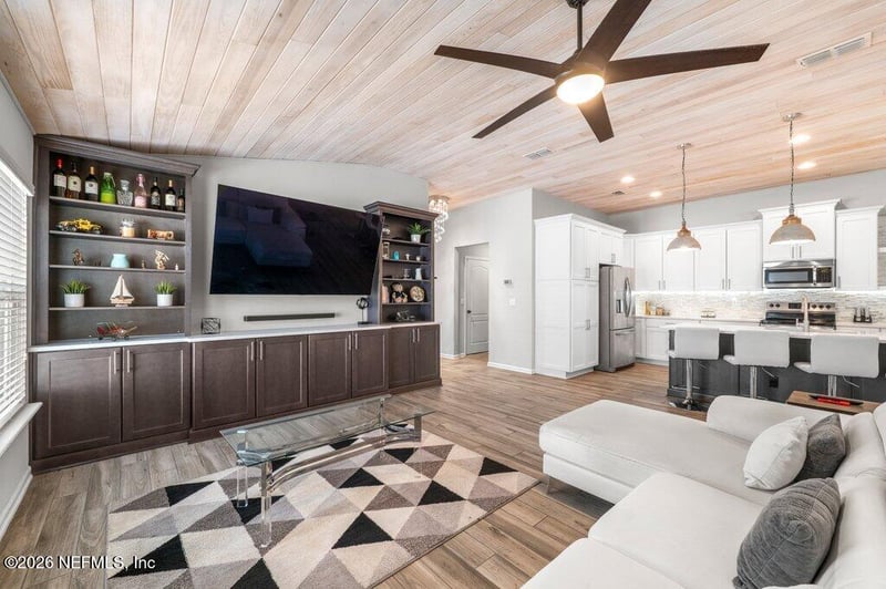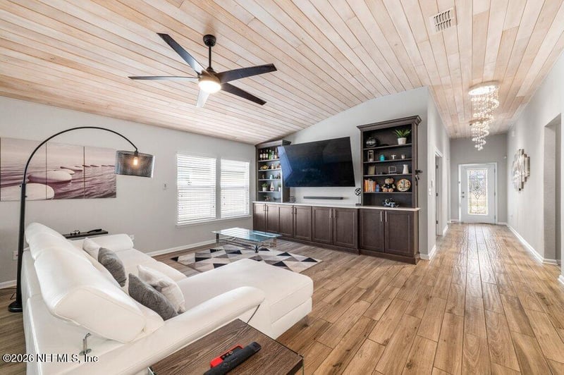 Listing details for 12520 Itani Way, Jacksonville, FL 32226 : Welcome Home! This is one you won't want to miss- with a thoughtfully upgraded living space, blending warmth, character, and modern design in all the right ways. Step inside to an open floorplan that feels both spacious and inviting. Wood-look tile flows throughout the main living areas, creating a clean, cohesive look that is as durable as it is beautiful. The living room is anchored by stunning custom built-ins surrounding the TV -- a true focal point that adds both style and functionality. The kitchen is a standout. Two-toned cabinetry paired with quartz countertops gives it a fresh, designer feel, while the island offers the perfect gathering space for entertaining. Look up and you'll find one of the home's most charming features -- a custom tongue-and-groove pine wood ceiling that adds warmth and character you simply don't see every day. Luxury light fixtures throughout elevate the entire space. The primary suite is a retreat of its own, featuring two large custom closets for exceptional storage. The ensuite bath offers a dual sink vanity and a spacious walk-in shower designed for comfort and ease.Function meets practicality with additional storage just off the garage entry and a well-appointed laundry space -- thoughtful details that make daily life seamless.Incredible, well-kept garage, currently used as a home gym offers a one of a kind, privacy pull down screen for the optimal man cave area! Allow fresh air in, but maintain complete privacy from the street! Step outside and unwind on your preserve lot, where privacy and peaceful wooded views create the perfect backdrop for morning coffee or relaxing evenings. This lot offers large side yards AND the benefit of double gates. Newer TRANE HVAC system was recently installed, so this home is truly worry free! 12520 Itani Way offers upgraded design, intentional storage, and serene outdoor living -- all in a growing Jacksonville community that feels tucked away yet conveniently located.