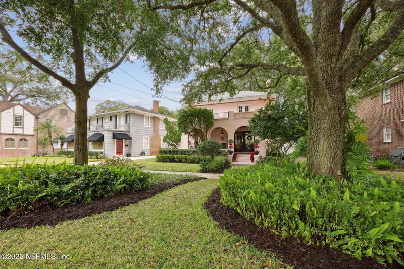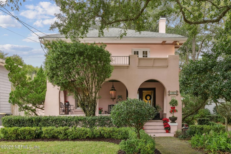 Listing details for 1287 Avondale Ave, Jacksonville, FL 32205 : Step into a cherished piece of history in the heart of Historic Avondale. Tucked among parks, gracious homes, & nearby estates, this enchanting residence welcomes you with a deep, inviting front porch adorned with a vintage ceiling light, mosaic tile floor, & built-in planters—an ideal spot for lingering conversations & evening breezes. Through grand double doors, the living room unfolds with glowing inlaid wood floors, soft wavy glass windows that bathe the space in light, & a timeless fireplace that anchors the room with its warmth. The dining room flows seamlessly into a charming kitchen with soapstone countertops, stainless work surfaces, a Sub-Zero glass-door refrigerator & Bosch cooktop. A charming half bath sits just off the kitchen & opens to a private courtyard with fountain (as-is), offering a peaceful retreat. Upstairs offers three bedrooms & a full bath with beautiful original tile, a laundry area, & French door opening to a rooftop balcony. Experience the character & timeless appeal of this historic neighborhood. Garage sold "as is". Fireplace screen, babies room - curtains, sconces, mirror, two front porch planters and art work do not convey.