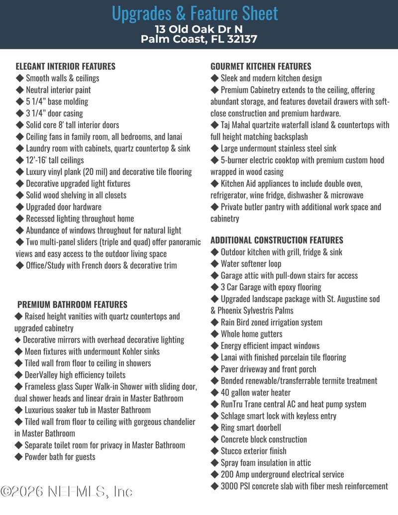 Listing details for 13 Old Oak Dr, Palm Coast, FL 32137 : Simply elevated in design and highlighted by soaring 12-16 ft ceilings, this luxury NEW CONSTRUCTION HOME on an expansive lot showcases exceptional craftsmanship, sophisticated finishes, and a seamless blend of elegance and comfort. At the center of the home is a stunning gourmet kitchen showcasing style and function. The private butler's pantry adds additional workspace and storage. A luxurious owner's suite offers a spa-inspired bathroom and spacious dual closets. Two multi-panel sliding glass doors seamlessly connect the interior living spaces to two grand lanais with an outdoor kitchen, creating the perfect setting for indoor-outdoor living year round. Enjoy a private study with French doors offering a quiet retreat. Even the laundry room is thoughtfully designed with cabinetry, utility sink, and generous counter space, blending everyday function with elevated style. Three additional bedrooms include one with a private ensuite bath, while the remaining two bedrooms share a well-appointed full bath. There is also a powder half bath conveniently located for guests. This stunning home features concrete block construction, energy-efficient windows, whole-home gutters, full irrigation, 3-car garage with epoxy flooring, and paver driveway. Designed to impress at every turn, this remarkable residence combines architectural elegance, high-end finishes, and resort-inspired outdoor living to create a truly elevated lifestyle experience. An extraordinary home designed for refined living and ready to welcome you home. Discover the hidden gem of Palm Coast in The Sanctuary, a private, gated boating community offering the perfect blend of tranquility, luxury, and Florida charm. Tucked away along the Intracoastal Waterway, this exclusive enclave featuring 175 homes, invites you to live each day like a vacation. Whether you're dreaming of expansive waterfront views or a lush, oak-shaded setting, this vibrant community offers something for everyone. More than just a neighborhood, The Sanctuary is a way of life. Spend your days sailing the Intracoastal, soaking in the sunshine, or exploring the surrounding natural landscape, all within the comfort of a secure, beautifully maintained community. The Sanctuary features pristine lakes and trails that wind through majestic old oak trees. Leaving The Sanctuary, you have easy access to an abundance of shopping and activities, most notably beautiful Atlantic beaches and several golf courses. From Palm Coast, you only need to travel a few miles on I-95 to explore northeastern Florida including Jacksonville, St. Augustine, Ormond, Orlando, and Daytona Beach, as well as many parks and attractions.