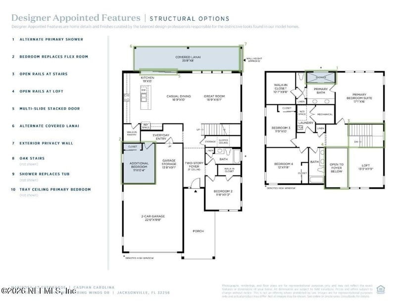 Listing details for 13030 Whispering Winds Dr, Jacksonville, FL 32256 : The Caspian welcomes you with a soaring foyer and is ideally situated on a desirable waterfront homesite, offering tranquil views and a beautiful natural backdrop. Beyond the entry, an impressive great room flows seamlessly into the casual dining area and well-appointed kitchen, featuring a large center island and walk-in pantry--perfect for entertaining and everyday living. A covered lanai extends the living space outdoors, ideal for relaxing and enjoying the waterfront setting. Upstairs, the primary suite offers a generous walk-in closet and a luxurious bath with dual vanities, a private water closet, and a spacious shower for a spa-like retreat. Two secondary bedrooms share a full bath, and a versatile loft adds additional living space. Additional highlights include a first-floor bedroom, flex room, upstairs laundry, everyday entry, and a spacious two-car garage with extra storage.