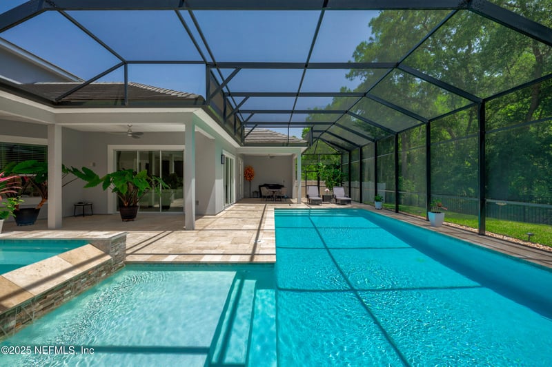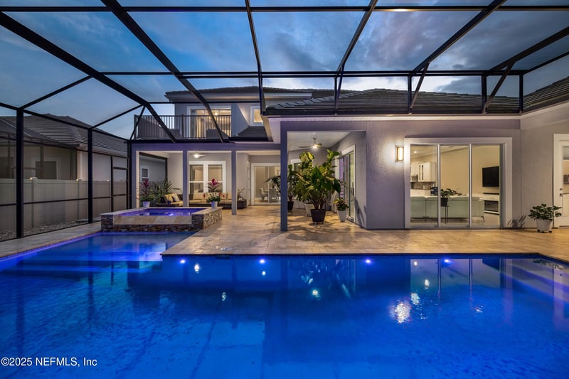 Listing details for 139 Aspinwall Pw, St Augustine, FL 32095 : OPEN HOUSE SUN. 11-1pm Located in a gated natural gas community of Markland, this beautifully appointed home offers 4 spacious bedrooms, 3 full bathrooms, and 2 half baths. Enjoy wooded preserve views from nearly every room. The expansive patio features multiple gathering areas and is pre-plumbed for a summer kitchen, perfect for entertaining. Relax in the heated saltwater pool & spa, surrounded by luxurious decking and immaculate landscaping. Thoughtful upgrades include built out closet systems, custom shelving in the pantry & laundry room, hardwood staircase, tile floor throughout, screened in lanai & motorized privacy screen. Several flexible spaces throughout the house. The upstairs sundeck/balcony provides a private escape with beautiful views. Additional features include 2 tankless water heaters, a spacious laundry room with a utility sink, French drain system around the backyard. CDD Bond is Paid off-O&M Remains
