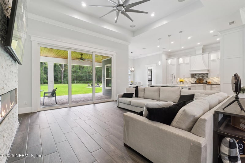 Listing details for 14121 Denton Rd, Jacksonville, FL 32226 : Experience luxury country living in Jacksonville, Florida at this meticulously designed estate on Denton Road. This stunning custom-built home blends high-end craftsmanship with modern comfort in a peaceful setting—perfect for holiday entertaining or cozy winter gatherings by the dramatic 72'' floor-to-ceiling stone fireplace. The open-concept living space features soaring ceilings, smooth-finish walls, integrated sound, and a seamless indoor-outdoor flow through 12' x 9' glass sliders. The chef's kitchen showcases dual porcelain islands, Thermador appliances, and hidden storage. The primary suite is a private retreat with dual designer closets, a spa-style bath, soaking tub, walk-through shower, and wall-mounted fireplace. Enjoy tranquil country charm just minutes from Jacksonville beaches, shopping, and the airport—a true North Florida gem! Two bedrooms with en-suites, a dedicated home office, and formal dining with exposed beams provide both functionality and charm. Step outside to a covered back porch that spans the entire length of the home or host unforgettable gatherings in the 34' x 20' covered outdoor kitchen equipped with a grill, burner, kegerator, and bar seating for 10, all under a rich cedar ceiling with integrated AV and lighting. Car enthusiasts and hobbyists will appreciate the 60' x 50' detached garage complete with four oversized doors, a 20' x 16' workshop, loft storage, and multiple power panels. Situated on over 3 acres with a private pond, gated entry, extensive paver drive, and nearly 80 landscape lights, this estate offers next-level living that's both elevated and grounded in comfort. Every detail, from CAT 6 wiring and smart home switches to professional landscaping and full-perimeter security, has been intentionally designed to enhance your daily life.