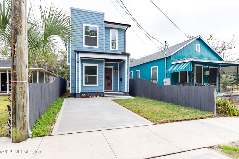 Listing details for 1415 Spearing St, Jacksonville, FL 32206 : Designed with first-time homebuyers in mind, this 3-bedroom, 2.5-bathroom home offers 1,227 square feet of well-planned living that blends everyday ease with modern design. This home offers the perfect blend of urban energy, only minutes from downtown and is a great location for those seeking a balance between the lively city atmosphere and easy access to and from highways for commuters. Inside discover a sizeable dining & living area w/stylish wood-looking accent wall, and custom finishes throughout. You will find an open-concept main level featuring plenty of counter space, quartz counters, backsplash, SS appliances, pendant lighting, pot filler, smart appliances, touch screen fireplace, Crown molding, on demand water heater, recess lighting and many more features. Upstairs, you'll find two spacious bedrooms, the primary suite which showcases an ensuite w/dual sink and large vanity. Fully fenced large back yard, Gutters, Wi-Fi flood light camera and driveway for extra parking.