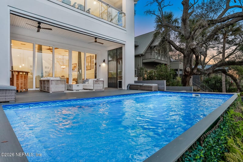 Listing details for 143 Washington St, St Augustine, FL 32084 : Welcome to modern luxury in the heart of one of America's most historic cities. Built in 2021, this stunning St. Augustine home perfectly blends contemporary design with an unbeatable setting overlooking Lake Maria Sanchez. Enjoy breathtaking water views from your back porch or while relaxing in your private pool, all while sitting nearly ten feet above sea level for added peace of mind. Inside, an incredible open floorplan welcomes you with soaring ceilings and a striking chandelier at the entry. The living room, kitchen, and dining area flow seamlessly together, framed by expansive sliders that open wide to merge indoor and outdoor living—perfect for entertaining or simply soaking in the view. Upstairs, all bedrooms are thoughtfully placed for privacy, including the owner's suite with a large balcony. Wake up each morning to priceless lake views and gentle coastal breezes. An automatic whole-house standby generator adds an extra layer of comfort and security, ensuring wor