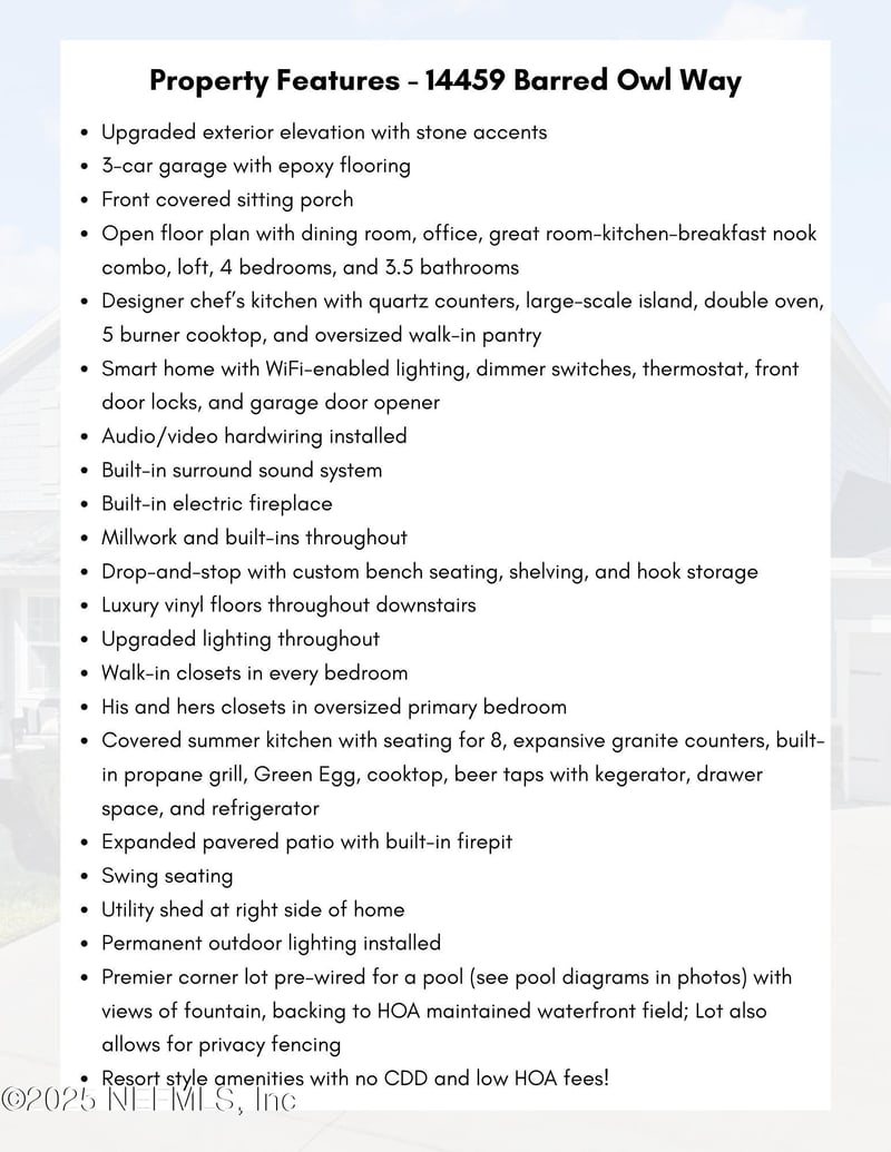 Listing details for 14459 Barred Owl Way, Jacksonville, FL 32259 : STUNNING corner-lot executive home featuring a summer kitchen, firepit, and outdoor paradise - this home checks (and surpasses) EVERY box! Welcome to this stunning 2018 home in sought after Bartram Creek. Perfectly positioned just minutes from State Road 9-B and I-95 for an easy commute (15 minutes to most areas of the Southside and only 20 minutes to the beach), and a short stroll to the vibrant brand new Durbin Pavilion Town Center for shopping, dining, movies, and entertainment. Every inch of this property has been impeccably upgraded creating a coveted home that feels refined, spacious, and perfect to entertain. Step inside to a bright, open-concept main floor featuring luxury vinyl plank flooring throughout, a dedicated office space with double french doors, formal dining room, custom-designed great room complete with built-ins, shiplap focal wall, a sleek built-in electric fireplace, and surround sound system perfect for a cozy night in. The upgraded chef's kitchen is truly the heart of the home - showcasing quartz counters, custom tile backsplash, oversized center island, stainless steel appliances including double oven, 5-burner cooktop, and a huge walk-in pantry. A separate eat-in breakfast nook overlooks the backyard for easy everyday dining. You'll also love the custom mudroom drop zone with built-ins, cubbies, and storage for functionality, perfectly positioned for daily convenience off your 3 car garage (which comes completely finished with epoxy flooring)! Upstairs, a spacious bonus loft offers endless possibilities - an additional living room, play room, home gym, or media space. The oversized primary suite is a peaceful retreat, featuring large his and hers closets, ensuite bath with garden tub, separate walk-in shower, and double vanity with quartz counters. Three additional bedrooms (each with walk-in closets), two more full bathrooms, and an oversized laundry room with extra storage space complete the second floor, offering comfort and flexibility - and the perfect end of day retreat! Outside, this corner-lot home truly shines, starting with the fully equipped permanent outdoor lighting system. The front yard also features an upgraded elevation featuring stone accents, charming front porch, and, of course, your 3-car garage with epoxy flooring. The backyard comes prewired for a pool (see pool diagrams in photos). The expansive pavered lanai is an entertainer's dream, boasting a full summer kitchen with oversized granite counter with seating space for 8, sink, refrigerator, propane grill, cooktop, Big Green Egg, beer taps with built-in kegerator, drawer space, and more. A TV mount with surround sound speakers creates the perfect setup for game days and gatherings. Enjoy evenings around your pavered firepit, relax on the backyard swing, and take in tranquil pond views beyond a manicured hedge for privacy. A utility shed provides additional storage for tools and yard equipment. The large open, waterfront field with fountain view behind your home is maintained by the HOA and fully accessible for your recreation needs. Zoned for top-rated schools and nestled in a community that offers a resort-style zero-entry pool, splash pad, playground, putting green, clubhouse, and year-round activities - all with LOW HOA fees and NO CDD fees - this home truly has it all! Homes like this are rare - call today for more information or to set up your private showing.
