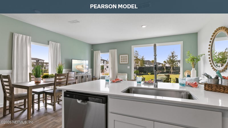 Listing details for 14474 Canter Rd, Jacksonville, FL 32234 : The Pearson townhome offers a smart and inviting design that makes the most of every square foot, delivering approximately 1,468 square feet of comfortable living space with three bedrooms and 2.5 bathrooms. This well-planned layout creates a sense of openness from the moment you enter, with the kitchen, dining area, and main living space flowing together to support both daily routines and special gatherings. The kitchen is designed as a true focal point, featuring an oversized bar that provides plenty of room for meal preparation, casual dining, and connecting with guests while you cook. Large sliding glass doors off the living area bring in an abundance of natural light, brightening the home and creating a warm, welcoming atmosphere throughout the day. Upstairs, the primary bedroom serves as a private retreat, complete with a spacious walk-in closet and a well-appointed bathroom with a large vanity. Two additional bedrooms offer flexibility for family, guests, or a home office.