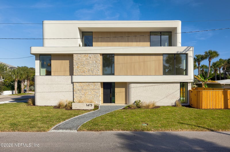 Listing details for 1475 Ocean Blvd, Atlantic Beach, FL 32233 : 1475 Ocean Boulevard is a new construction, six bedroom, five bath home one block from the Ocean, and beach access. Kitchen, living and dining are on the first floor, with appliances from Dacor and La Cornue. The range hood is artisan plasterwork, as are the rounded, curved stairways to the upper floors. This first floor living space opens to the private backyard with splash pool. Also on the first floor, a purpose-built, privately situated bedroom to accommodate a multi-generational lifestyle. On the second floor, four bedrooms, including the primary suite, master bath with soaking tub, custom walk-in closets and a north facing 19' wide tiled balcony. The third-floor flex space has an ample array of cabinets and countertops, wet bar, beverage fridge and full bath off the main room. Also adjacent to this main space is the sixth bedroom and a 22' wide tiled balcony, bringing in sounds and breeze from the ocean.