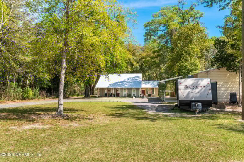 Listing details for 14992 Water Oak Ln, Sanderson, FL 32087 : Tucked at the end of a quiet dead-end street, this beautifully remodeled 2 bed, 2 bath home offers over 150' of frontage on the Little St. Marys River. Inside features wood laminate and tile flooring throughout, vaulted ceilings, abundant natural light, and a charming upstairs loft. The spacious kitchen includes a large food prep island, perfect for entertaining, while the primary suite boasts a luxurious bath. Enjoy outdoor living with covered front and back porches, a firepit, and a unique cowboy hot tub. The property also includes a 2-stall barn, greenhouse, and a detached 30x40 insulated garage with a newly installed car lift and custom shelving. With a metal roof and Hardie lap siding, this private riverfront retreat offers comfort, character, and space to live, work, and play. ***kitchen appliances, washer, dryer, cowboy hot tub, firepit, greenhouse, car lift all convey with sale***
