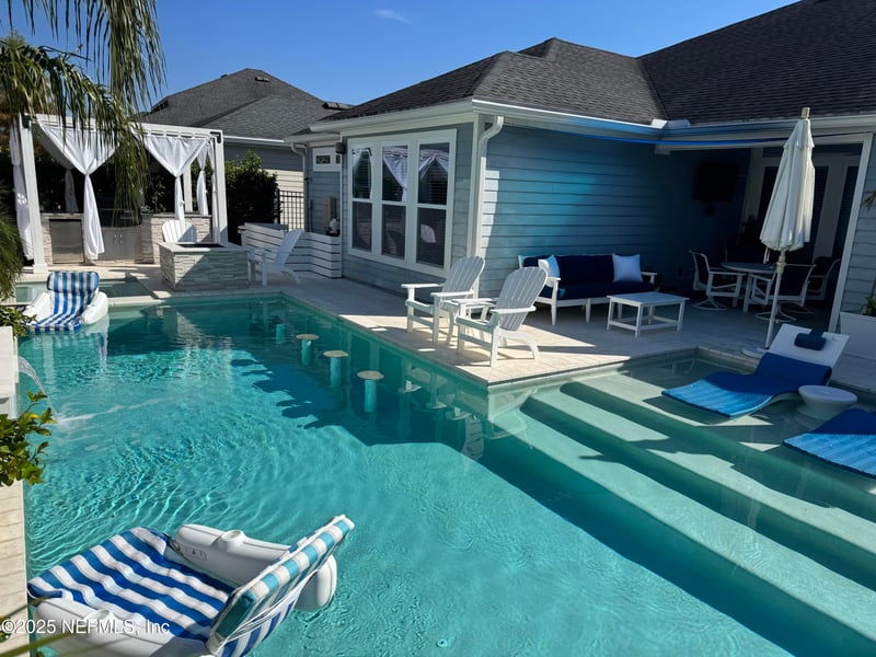 Listing details for 151 Woodsong Ln, St Augustine, FL 32092 : Come check out this beautiful Resort Style Pool Home, 4 BR/3 BA, David Weekley Model, located in North Creek at Shearwater. Enjoy the front porch for your morning coffee or an evening cocktail. The heart of the home is the open concept kitchen with a large island. A dream for anyone who loves to cook and entertain. Lots of cabinetry for storage and a nice size pantry. The floor plan is thoughtfully laid out with maximum privacy for all bedrooms. The backyard is your spa retreat. Large size pool with sundeck, bar stools, jacuzzi, gas fire pit, covered outdoor kitchen with high end gas grill, fridge, sink, ice cooler and whole house generator. Fully fenced in with privacy hedges. Whole house cat 6A internet connection. Epoxy floors in the garage. Shearwater offers a variety of amenities including tennis courts, nature trails, Golf cart/walking/jogging path, playgrounds, kayak launch and the Kayak Club with a Resort Style lagoon, lap pool, lazy river, water slide, clubhouse & a gym.