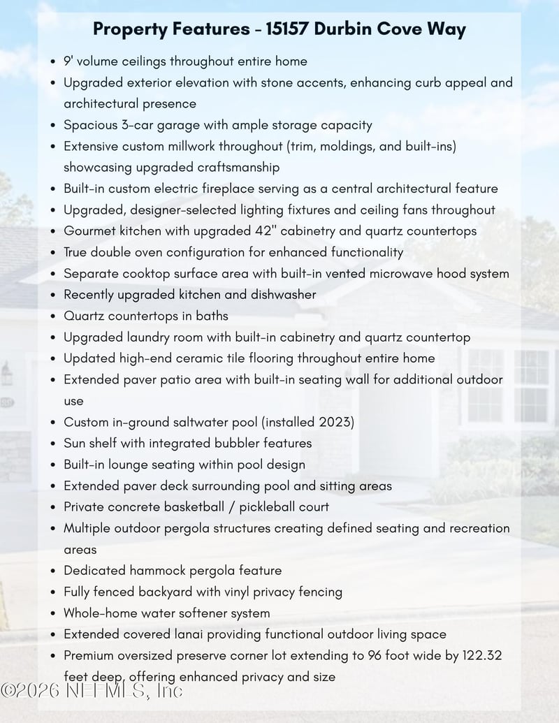 Listing details for 15157 Durbin Cove Way, Jacksonville, FL 32259 : A Once-in-a-Lifetime Find - Your Perfect Oasis Awaits! Welcome to this impeccably maintained POOL home (pool installed in 2023), BUILT IN 2021, and perfectly situated within walking distance of the vibrant Durbin Park Town Center, offering an array of shopping, dining, movie, and entertainment options. With quick access to State Road 9B and I-95, you can reach most key destinations (including the beach) in 20 minutes or less! As you step inside, you'll immediately notice the attention to detail and premium finishes throughout. The spacious, open-concept living area features elegant ceramic tile flooring (absolutely no carpet in this home)! A stunning floor-to-ceiling built-in electric fireplace creates a warm and inviting ambiance, and the overlooking gourmet kitchen serves as a true chef's masterpiece, equipped with a double oven, contemporary finishes, and upgraded appliances (the refrigerator and microwave were recently replaced!), making it perfect for entertaining. This highly upgraded home features architectural details throughout, including beautiful millwork, molding, and interior trim that are a must-see in person! The standout feature of this immaculate residence is your own private outdoor paradise! The meticulously designed backyard boasts a sparkling saltwater pool, a cozy fire pit retreat, secluded pergola seating area, and a versatile basketball court that doubles as a pickleball court for endless fun! Host memorable gatherings or relax in your private oasis, all within your fully fenced quarter-acre corner lot that backs to protected preserve. This remarkable home is also just steps away from the community amenity center, which includes a zero-entry pool, kids' splash area, playground, putting green, and the bus stop location for the outstanding neighborhood schools. Numerous sports fields are also available within the community, all supported by an incredibly low HOA fee of just $201 per quarter! Completing this exquisite home is a spacious 3-car garage and extended driveway, water softener system, and absolutely nothing left to do - except to move in. Don't miss your chance to claim this piece of paradise and experience an unparalleled lifestyle!