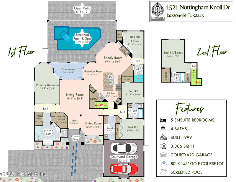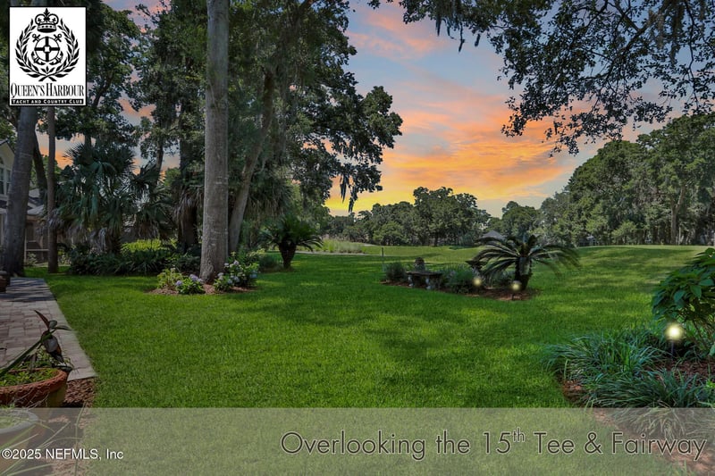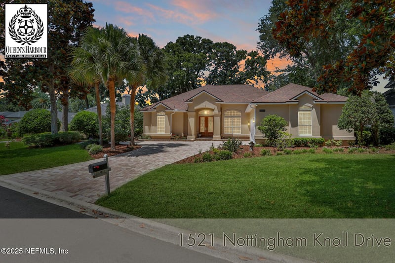 Listing details for 1521 Nottingham Knoll Dr, Jacksonville, FL 32225 : This gorgeous home sits pretty on a spacious lot overlooking the Mark McCumber designed championship golf course in the exclusive gated community of Queen's Harbour. It has five ensuite bedrooms and over 3,300 sq ft of indoor living space. An added bonus is the 860 sq ft of screened outdoor living complete with an inground pool and spa. This home has room for everyone. Pull up the expanded paver driveway and you'll immediately notice the charming courtyard entry garage. The magnificent eight-foot leaded glass double doors topped with an arched transom window create a grand entrance that floods the foyer, living room, and dining room with natural light. Step inside and prepare to be wowed by the incredible water-to-golf course views through the living room's wall of windows. The large-format travertine and gleaming engineered wood floors throughout the main level add an elegant touch that's both beautiful and practical. The spacious dining room can and has hosted dinner parties for twelve or more, making it perfect for entertaining. But the real showstopper is the Great Room, which truly serves as the heart of this home. This naturally-lit space features a wall of windows and glass doors with fabulous water-to-golf views from every angle. The luxuriously updated kitchen is a chef's paradise with a huge island that seats six for dining and gathering space for more. The breakfast nook and comfortable den with marble hearth gas fireplace is paired with an floor-to-ceiling custom wood display cabinet. This is amazing space. The furniture-inspired Thomasville Custom Cabinetry with two-tier stacked upper cabinets features a glass display gallery to showcase all of for your attractive dishware and collectibles. Soft-close doors, custom inserts, and soft-glide drawers highlight the quality construction. The exotic and rare double straight-edge granite countertops with matching seamless backsplash create a cohesive, designer-inspired look. Two built-in tumbled travertine beverage stations add convenience and style. One serves as a coffee station while the other handles adult beverages, both feature ambient lighting and custom glass shelving. The glass entry pantry closet with custom shelving keeps everything organized and clutter-free. The kitchen comes equipped with a top-of-the-line Thermador appliance package including a six-burner gas range topped with a limestone exhaust hood, seven-foot three-door French-style refrigerator, and Sapphire dishwasher. Off the great room, through the breakfast nook to the sun room. The Sun Room has double sliders leading to the outdoor screened living space with sparkling pool and spa overlooking the park-like backyard. Beyond the screened enclosure is a huge open patio extending the outdoor entertainment options even further especially with the incredible expansive long-views of the golf course. The thoughtful three-way split bedroom floor plan works perfectly for multi-generational living. The primary bedroom, located just off the foyer, features a vestibuled entry with an oversized bedroom on one side and a resort-style bath on the other. This tremendous bathroom includes a soaker tub, oversized shower, two separate vanities, water closet, and two walk-in closets. The sleeping area has a generously sized sitting area with French doors to the sun room and pool. On the opposite side of the home, the guest bedroom wing includes bedrooms two and three sharing a Jack and Jill bath with double sinks and linen closet. Both bedrooms are generously sized, with one featuring a walk-in closet. Upstairs you'll find the oversized fourth bedroom with ensuite bath. The fifth bedroom, currently used as an office, sits separately off the great room with its own central hall entry and full bath. Built-in shelving, a walk-in closet, and golf course views make this space incredibly versatile. With over 1,000 acres, Queen's Harbour is boarded by the St. Johns River, Greenfield Creek and the Intracoastal Waterway. With 1,000 single family homes, residents can enjoy a number of activities including walking, running, or biking on over 26 miles of landscaped roads. The community has a 110-foot boat lock for access to the Intracoastal Waterway along with a Marina with 65 slips. Residents can also enjoy playing a match on one of the 8-lighted Har-Tru tennis courts, or play a round or two on the Mark McCumber designed 18-hole golf course. Swim a lap at the Olympic Sized Adult Pool or enjoy family time at the Children's Pool or playground. Stay healthy in the 4,000 square foot fitness center or play a match on the Soccer Field. New amenities include a New Pavilion, 4 Pickleball courts, a Basketball Court and an expanded play experience at the KidZone.