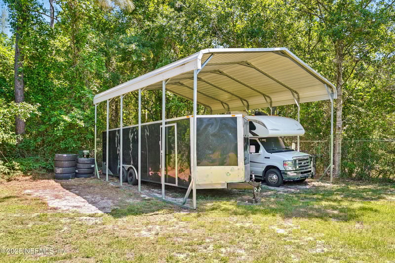 Listing details for 1537 Elmar Rd, Jacksonville, FL 32226 : Discover the perfect blend of peaceful rural living and convenient suburban amenities in this charming ranch style, 3 bedroom, 2 bath home. Imagine relaxing on the welcoming 24' covered front porch and enjoying the freedom of a spacious 0.75-acre property without HOA restrictions. This property is a dream for anyone who loves the outdoors, offering covered parking for your boat - no need to lower those fishing poles! - as well as covered RV parking. You'll find plenty of storage space with a 2-car attached garage, a detached garage with 30 amp service, a significant 15' high metal carport (24x46) also equipped with 30 amp service, and a fully fenced backyard with a convenient wide gate on the side yard. Inside, you'll appreciate the open floor plan, cleverly defined by a half wall between the kitchen and living room. Enjoy casual meals in the eat-in kitchen and host gatherings in the formal dining room. The glass-enclosed Florida Room provides versatile space for a home office, playroom, or a peaceful retreat. Just off the Florida Room, an open patio invites you to grill out and/or cultivate your favorite plants. The current homeowner has taken exceptional care of this home, ensuring it's move-in ready with numerous updates. These include new wood block countertops, stainless steel kitchen appliances, double-insulated windows, and a new roof installed in 2018. Recent upgrades in 2025 feature exterior vinyl siding on the sides and rear, an updated HVAC system with an Alexa thermostat, and a refreshed hall bathroom shower. The septic system was pumped out in 2024. Notably, the current owner benefits from approximately $350 in savings on homeowners insurance due to installed hurricane clips. Enjoy the convenience of being within walking distance to Tom Marshall Park, a city park offering a playground, batting cages, covered picnic tables, baseball and basketball courts, and a concession stand. For young baseball enthusiasts, the Northside Athletic Association has sign ups for their leagues at the park. This location offers a quick commute to Mayport Naval Base and provides easy access to Jacksonville International Airport, the Amazon warehouse, VA Hospital, and UF North Hospital. This home truly offers a unique blend of comfortable living and outdoor convenience.