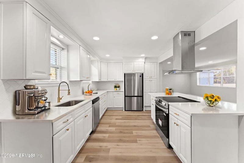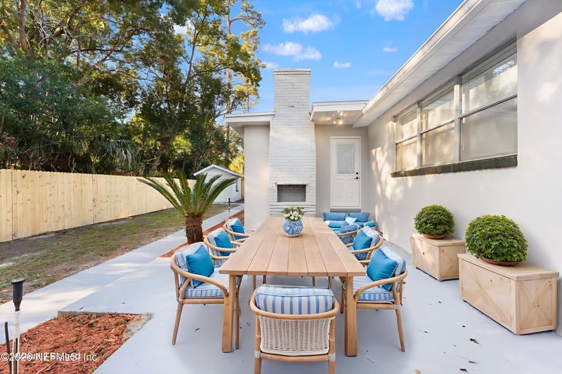 Listing details for 1554 Shirl Ln, Jacksonville, FL 32207 : Welcome to 1554 Shirl Lane—a sprawling mid-century modern ranch that's been thoughtfully updated for today's lifestyle. Now converted to a spacious 4-bedroom, 2.5-bath home, this beauty blends classic low-slung charm with fresh, modern upgrades throughout. Step inside to discover brand-new flooring, beautifully renovated bathrooms, and a huge, show-stopping kitchen featuring crisp white quartz countertops and a generous breakfast bar—perfect for morning coffee, weeknight dinners, or hosting a crowd. The enormous bonus family room creates the ultimate entertaining space, game room, or media lounge—your options are endless. Major improvements include a new water heater, new septic tank, and new drain field, offering peace of mind for years to come. The private backyard is your own retreat, complete with a patio, storage shed, and a chic brick outdoor fireplace—made for cozy evenings and weekend gatherings under the stars.
