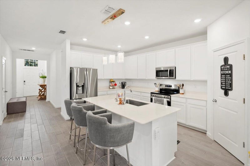 Listing details for 15608 Whispering Fir Dr, Jacksonville, FL 32218 : Better than new and truly move-in ready, this beautifully maintained 4-bedroom, 3-bath home offers upgraded features the builder is no longer including. Bright, airy, and impeccably cared for, the interior showcases quartz countertops, wood-look tile flooring, abundant natural light, and statement lighting that elevates each space. A private bedroom with its own ensuite bath provides exceptional flexibility for guests or multi-generational living. The custom built-in entertainment wall with adjustable accent lighting creates a striking focal point in the main living area. Step outside to a screened lanai overlooking protected community green space with no direct rear neighbors, offering added privacy while still enjoying neighborhood living. All appliances and water softener convey. Resort-style amenities include pool, fitness center, playground, and tennis courts. Experience this beautiful home and community in person and schedule your showing today