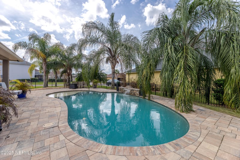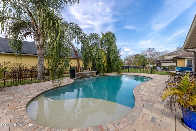 Listing details for 157 Toscana Ln, St Augustine, FL 32092 : Beautiful home has it all! Saltwater pool with a waterfall, beach entrance, and pavers. Outdoor shower conveys. Media room includes risers, chairs, projector, screen and everything else you see when you look at it. Home has four bedrooms plus an office. Media room would be the fourth bedroom. Kitchen with granite countertops and 42'' cabinets has just added a new refrigerator and dishwasher. Stone accents the back splash and the island. Walk-in pantry. There is an eat-in area next to the kitchen. Open floor plan. Bedrooms are large and have walk-in closets. There is a double tray ceiling in the master bedroom with canned lighting for reading. Three car garage. Inside laundry room. Washer and dryer convey. Security cameras are outside the home and sellers are leaving those plus the monitor. The freezer in the garage stays but they are taking the refrigerator which is out there. The fireplace hanging in the sitting area does not convey. The roof was replaced in 2018.