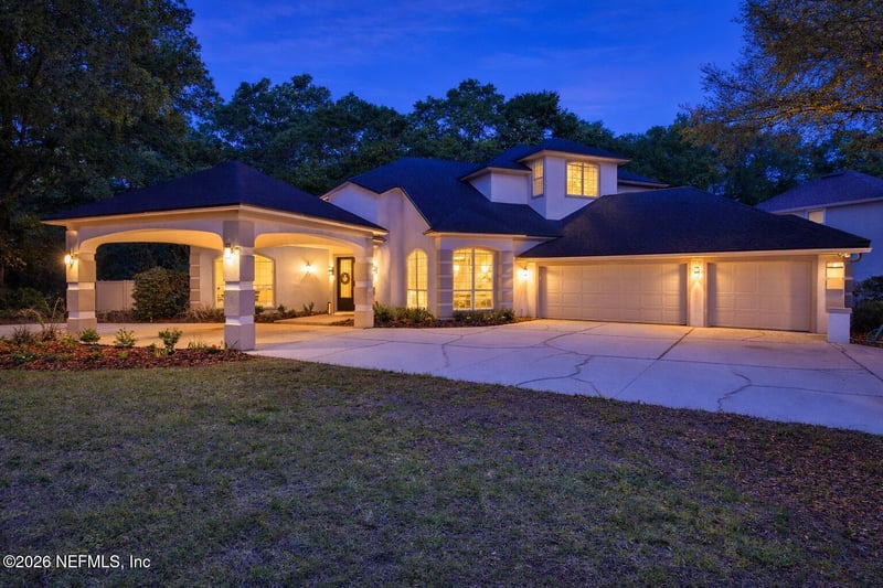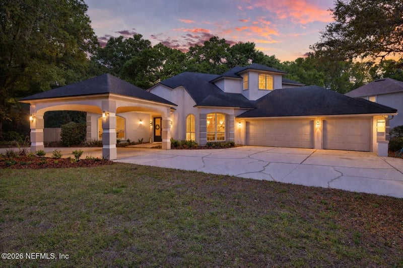 Listing details for 1611 Pebble Beach Blvd, Green Cove Springs, FL 32043 : Welcome to 1611 Pebble Beach, a once-in-a-lifetime opportunity to own a beautifully renovated estate tucked away on a private cul-de-sac. From the moment you arrive, the circular driveway and elegant porte-cochere create a grand first impression, offering both convenience and timeless curb appeal. Step through the double front doors into a stunning front sitting room highlighted by soaring ceilings and new luxury vinyl plank flooring that flows seamlessly throughout, setting the tone for this fully updated, move-in-ready home.