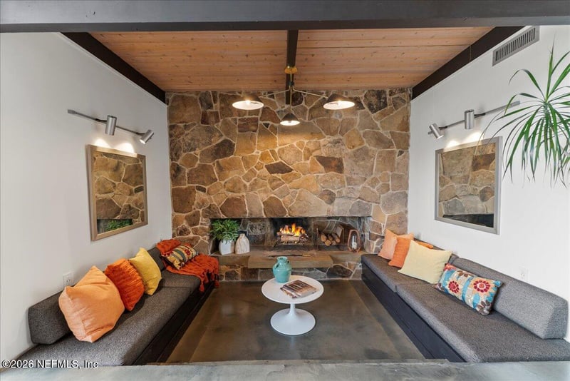 Listing details for 1649 Brookside Cir, Jacksonville, FL 32207 : Glistening water, marsh views, and mid-century modern lines create a setting that feels effortlessly elevated and anything but ordinary. Thoughtfully designed by the original owners, this 3-bedroom, 2-bath residence celebrates light, volume, and connection to the river. Vaulted cedar ceilings with substantial wooden beams, clerestory windows, slate flooring, and walls of glass frame panoramic waterfront vistas and a sunken conversation lounge—also known as a chat pit—that is truly the best you have ever seen. The remarkably open floor plan flows seamlessly from room to room, making it an entertainer's dream with a bar area that was all the rage in its era, perfect for memorable gatherings. Updated kitchen and baths, plus smart house features, quietly support modern living. Step out to a full-width back deck and covered porches, and a private dock with boat lift and jet ski slip. You really can have it all - architectural significance, on the water, in the heart of Jacksonville.