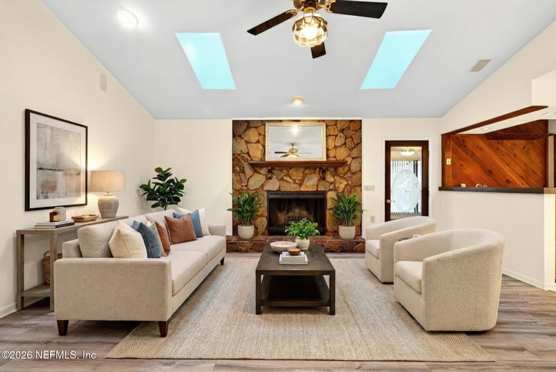 Listing details for 1666 Village Way, Orange Park, FL 32073 : Truly one-of-a-kind, this 3-bedroom, 2-bath home on a 1/2 acre lot! This home seamlessly blends character, charm, and a deep connection to nature. Featuring three spacious living areas. The living room with the fireplace offers built-in surround sound for an immersive experience, a fully functioning wet bar, and a stunning indoor atrium. This home floods with natural light and offers flexible spaces for relaxing, entertaining, and everyday living. Thoughtfully updated with new paint, mid-century touches, and custom details, the character of this home must be seen in person to truly appreciate. The kitchen features custom-added cabinetry with a hidden spice rack and flows effortlessly into the dining area. An indoor laundry room leads to the two-car garage, where a fully functioning fridge and deep freezer convey with the home, adding convenience and functionality. Outside there is a 2-space carport, and an added RV carport space with a 220-volt plug--perfect for outdoor gatherings. and entertaining. The grounds have been carefully curated for the nature enthusiast. Ten fruiting trees-including lemons, limes, oranges, clementines, grapefruits, blueberries, figs, and tangerines--enhance the outdoors. The outbuildings have water access via a well and the irrigation system is on a well.
