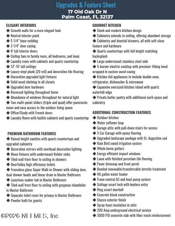 Listing details for 17 Old Oak Dr, Palm Coast, FL 32137 : Step into this BRAND NEW 2025 4 BEDROOM, 3.5 BATHROOM, 3 CAR GARAGE concrete block home in the quaint Sanctuary. Preferred lender rate available at 3.99% for qualified buyers. This stunning home is designed with luxury, comfort, and effortless entertaining in mind. A warm neutral palette, smooth walls and ceilings, and refined architectural details instantly elevate the space with timeless elegance. Soaring 12-16 ft CEILINGS provide an airy ambiance, while wide luxury vinyl plank flooring adds warmth and durability underfoot. Enjoy expansive windows and multi-panel sliding glass doors, bringing the outside in and highlighting the home's open inviting layout. At the heart of the home is a chef's dream GOURMET KITCHEN that is sleek, modern, and incredibly functional. Quartz countertops stretch across an oversized waterfall island and continue as a full-height backsplash, perfectly complementing the ceiling-height premium cabinetry. Tucked nearby is a private BUTLER'S PANTRY offering additional workspace, storage, and elegance rarely found. Adjacent to the main living areas is a private OFFICE with French doors providing the perfect retreat for working from home or quiet reflection. The spacious laundry room, complete with built-in cabinetry and quartz counters, brings both style and convenience to daily routines. The luxurious primary suite offers a peaceful escape, featuring a SPA-INSPIRED BATH with a frameless glass super shower, dual shower heads, a deep soaking tub, double vanities with quartz counters, and a private water closet. Three additional bedrooms are generously sized with ample closet space and are thoughtfully positioned to offer privacy and comfort for family or guests. Two well-appointed full bathrooms with upgraded finishes serve the secondary bedrooms, while another convenient half bath is ideally located for guests. Outdoor living has been thoughtfully designed with a sprawling DOUBLE LANAIS with an OUTDOOR KITCHEN, ideal for year-round entertaining. There is endless potential with ROOM FOR A POOL to create a private resort-style retreat. This home is the perfect blend of modern luxury, thoughtful details and timeless comfort. Discover the hidden gem of Palm Coast in The Sanctuary, a private, gated boating community offering the perfect blend of tranquility, luxury, and Florida charm. Tucked away along the Intracoastal Waterway, this exclusive enclave featuring 175 homes, invites you to live each day like a vacation. Whether you're dreaming of expansive waterfront views or a lush, oak-shaded setting, this vibrant community offers something for everyone. More than just a neighborhood, The Sanctuary is a way of life. Spend your days sailing the Intracoastal, soaking in the sunshine, or exploring the surrounding natural landscape, all within the comfort of a secure, beautifully maintained community. The Sanctuary features pristine lakes and trails that wind through majestic old oak trees. Leaving The Sanctuary, you have easy access to an abundance of shopping and activities, most notably beautiful Atlantic beaches and several golf courses. From Palm Coast, you only need to travel a few miles on I-95 to explore northeastern Florida including Jacksonville, St. Augustine, Ormond, Orlando, and Daytona Beach, as well as many parks and attractions.