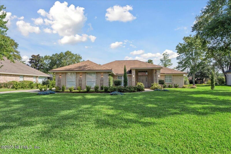 Listing details for 1806 Royal Fern Ln, Fleming Island, FL 32003 : Experience Florida living in this fully renovated 4-bedroom, 2-bath brick home in the exclusive Pace Island gated community. At 2,424 sq ft and priced under $600K, this stunning home offers water views, abundant natural light, and a serene pond behind a spacious covered porch. The split floor plan includes a luxurious owner's suite with water views, a spa-style bath with soaking tub, tiled shower, and dual walk-ins. The modern kitchen boasts quartz countertops, stainless steel appliances, and flows into a family room with a cozy fireplace. Tile flooring, stylish lighting, and a tankless water heater add turnkey appeal. Community perks include 2 pools (one Olympic size), tennis and basketball courts, clubhouse, playground, dock on Doctor's Lake, trails, and nearby wildlife refuge. Close to Jacksonville and Orange Park, this dream home won't last—schedule your private tour today!