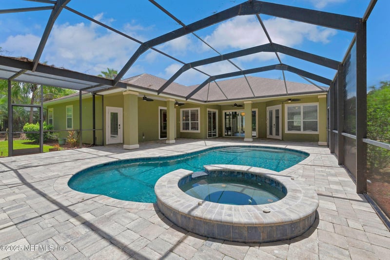 Listing details for 1818 Cobblestone Ln, St Augustine, FL 32092 : Experience Florida luxury living at its finest in this beautifully upgraded 5-bedroom, 3-bath pool home, nestled on a private cul-de-sac lot in the gated community of King & Bear in World Golf Village. With over 3,000 square feet of living space, this move-in-ready home features an open-concept layout, soaring ceilings, engineered hardwood floors, crown molding, a gas fireplace, and custom finishes throughout. At the heart of the home is a gourmet kitchen with granite countertops, a large center island, stainless steel appliances, and a spacious walk-in pantry—perfect for both everyday living and entertaining. The main-level primary suite offers a tranquil retreat with a tray ceiling, dual walk-in closets, and a spa-like en-suite bath with a soaking tub and separate shower. Upstairs, a versatile bonus room provides the ideal space for a media room, playroom, or guest suite. Step outside to your own private oasis with a screened lanai, sparkling pool and spa, and a paver deck.