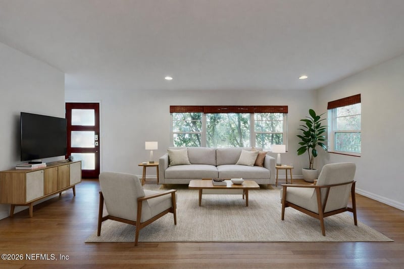 Listing details for 1827 Cherry St, Jacksonville, FL 32205 : Mid century modern home in the heart of Avondale that is fully updated and move in ready. Open floor plan with abundant natural light throughout the main living areas creating a bright and inviting space. Updated kitchen with modern finishes ample cabinet space and clean design. Spacious layout with large bedrooms and flexible living areas perfect for work from home or entertaining. Private fenced backyard with a large deck ideal for relaxing or hosting gatherings. Rare two car garage provides excellent parking and storage which is hard to find in this area. Located just minutes from the St Johns River Shoppes of Avondale Riverside Five Points and King Street dining and nightlife. Enjoy the character of a historic neighborhood with the comfort of modern updates in one of Jacksonville most desirable locations. Some Photos Digitally Staged