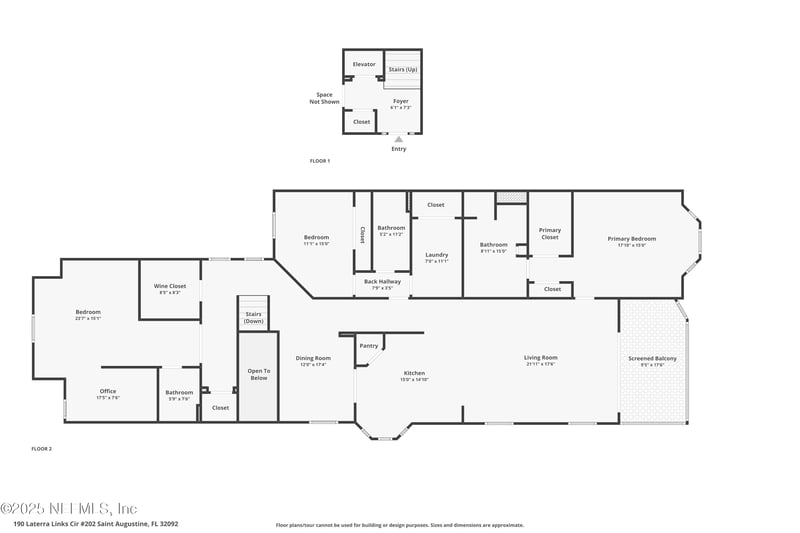Listing details for 190 Laterra Links Cir #202, St Augustine, FL 32092 : Elegant top-floor condominium in Laterra Links, featuring a private elevator, oversized two-car garage, and soaring vaulted ceilings with treetop and lake views from nearly every room. Located behind the gates of The King & The Bear in World Golf Village, this refined residence offers resort-style amenities and a true lock-and-leave lifestyle. The kitchen has been completely remodeled with a sophisticated European influence, showcasing custom designer cabinetry with decorative end caps, Taj Mahal natural stone countertops, an extended California-style island with exceptional storage and bar seating, and a fully integrated Dacor French-door refrigerator for a seamless, built-in look. Additional premium upgrades include a Bosch dishwasher, GE Profile range with double ovens, custom tile backsplash, and thoughtfully curated lighting that enhances the warm, cohesive aesthetic. The dining room, anchored by an elegant crystal chandelier, flows effortlessly into the spacious living areaan inviting space for both entertaining and everyday relaxation. A wall of windows frames calming treetop and lake views, filling the home with natural light and creating a tranquil ambiance. Durable tile flooring extends throughout the entire residence. The private primary suite offers serene lake views, two large closets, and a spacious ensuite bath with dual vanities, a soaking tub, and a frameless glass shower. A separate guest suite is positioned for comfort with an adjacent full bath. The expansive flex room above the garage is currently configured as two office spaces with a temporary wall that can be easily removed to restore one large bonus areaideal for a studio, media room, guest suite, or additional living space. A dedicated full bath makes the creation of a secondary guest suite simple and convenient. Additional features include a full laundry room, private entry courtyard, and an oversized garage with built-in storage shelving. Residents of Laterra Links enjoy exclusive access to a resort-style pool, spa, clubhouse, fitness center, and outdoor grilling area. Homeowners also have full use of the King & Bear amenities, including a 5,000 sq ft fitness center, heated lap pool, tennis and pickleball courts, playground, and walking trails. World Golf Village offers two championship golf courses, multiple membership options, and dining at the clubhouse. With its elevated design, high-end kitchen renovation, private elevator, and peaceful setting, this residence delivers a rare blend of luxury, convenience, and low-maintenance living in one of St. Augustine's most desirable communities.