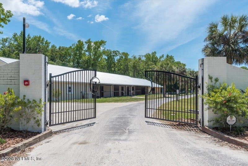Listing details for 2005 Bennett Rd, St Augustine, FL 32092 : Set on over 19 pristine acres, 2005 Bennett Road offers a rare blend of luxury living and premier equestrian amenities in St. Augustine. This fully renovated estate features a 3,286 sq ft brick home with 4 bedrooms, 3.5 baths, cathedral knotty pine ceilings, and rich hardwood floors. Designed for both comfort and function, the property includes a 28-stall barn with new and oversized stalls, fans, and mats, plus 15 lush paddocks, 11 with run-in shelters. A large arena with premium footing and drainage supports optimal training conditions. Five wash stalls, new water systems, updated roofs, and a lightning protection system add peace of mind. Enjoy a private creek, scenic bridge, and expansive grounds offering privacy and income potential, all just minutes from top-rated schools, shopping, and dining.