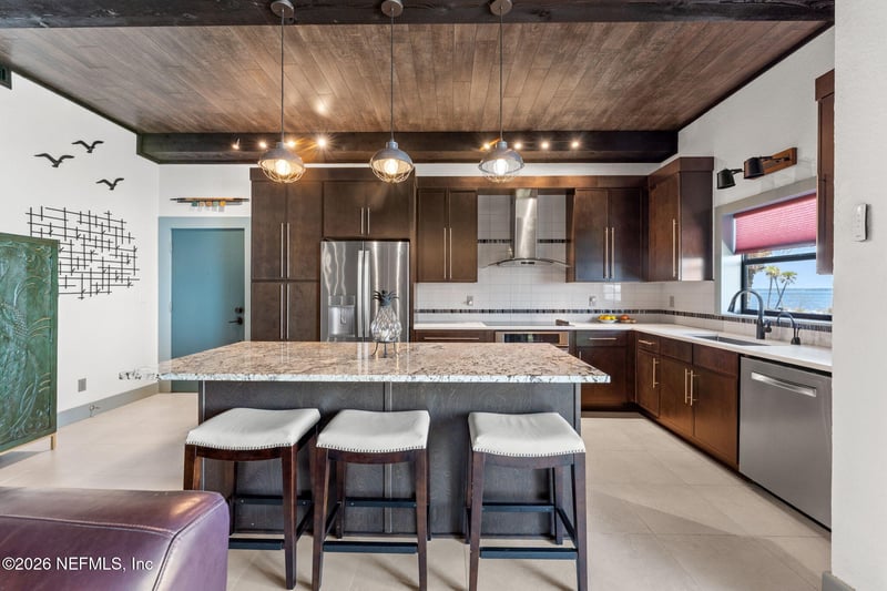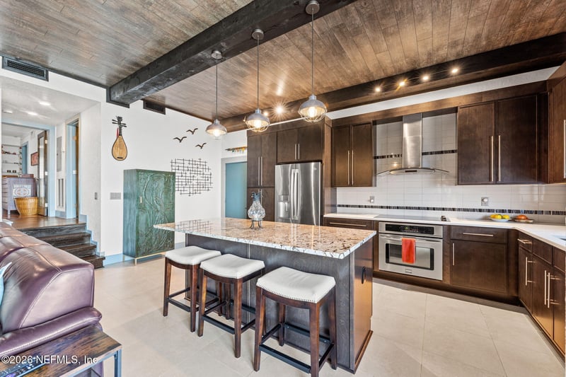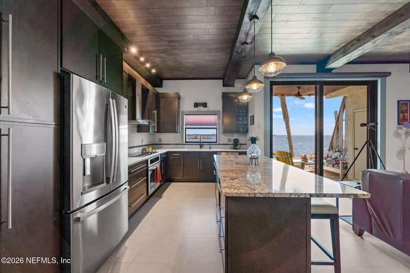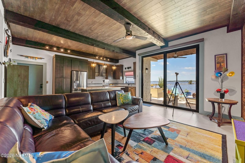 Listing details for 2201 Astor St #3, Orange Park, FL 32073 : AN OASIS ON THE RIVER! Tranquil river views, refined design, and curated upgrades create a lifestyle that feels more like a retreat than a residence. Nestled within the Club Continental & designed by an HGTV Dream Home designer; this ground-floor unit offers a thoughtfully designed layout, including a secondary bedroom reimagined as a loft style riverfront office with stunning views as your focal point. The fully transformed kitchen is both striking and functional, featuring new cabinetry, upgraded countertops, new stainless-steel appliances. The main living area is elevated by a custom wood-paneled ceiling with exposed beam detail, and added sound-reduction, creating warmth, character, and quiet comfort while framing stunning views of the St. Johns River. The primary suite serves as a private retreat with oak hardwood flooring, a custom closet, elegant plantation shutters, and a spa inspired bathroom complete with a floor to ceiling marble tiled glass shower Additional highlights: LVP flooring in hallway/office, no carpet, surround sound wiring, washer/dryer and living room TV conveying, water softener, updated electrical panel (2022), water heater (2026), and added patio/carport storage. Nestled near Club Continental, residents enjoy peaceful surroundings, stunning St. Johns River views, a prime location, and optional access to dining, swimming, and tennis; offering a true resort-style lifestyle.