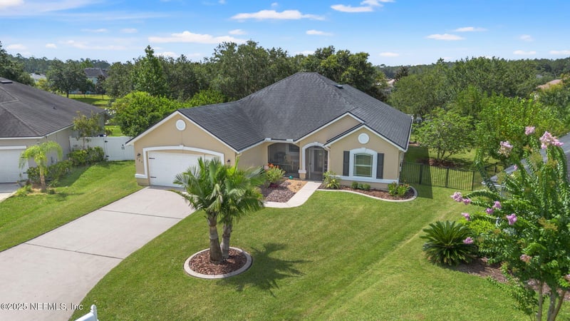 Listing details for 227 Deerfield Glen Dr, St Augustine, FL 32086 : Tucked away on a quiet cul-de-sac, this charming home offers peaceful pond views, lush landscaping, and a spacious, open layout perfect for relaxing or entertaining. With 3 bedrooms plus a dedicated office (or 4th bedroom), there's room for everyone. Inside, enjoy 10' ceilings, crown molding, and low-maintenance wood-look flooring throughout. The kitchen features 42'' cabinets, stainless steel appliances, and a built-in wine cooler. The owner's suite includes bay-style windows, dual walk-in closets, a soaking tub, and a separate shower. Enjoy the screened front porch with a cozy side seating area, and unwind on the screened back porch overlooking a fenced yard with fig, mulberry, and blueberry bushes—all on a ¼-acre lot. Extras include easy-install fabric hurricane shutters, a hard-wired generator hookup, and a transferable termite bond. Washer & dryer, refrigerator, stove, beverage refrigerator, and water heater are all new, and the outside A/C condenser was replaced in 2021.