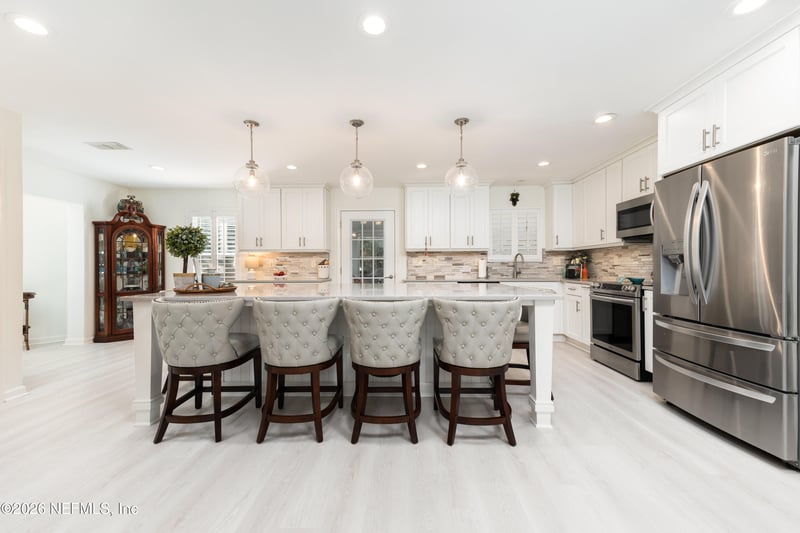 Listing details for 2280 Oak Forest Dr, Jacksonville Beach, FL 32250 : Tucked into one of Jacksonville Beach's most cherished family neighborhoods, this exceptional home offers the rare combination of space, elegance, and a true sense of community. On Oak Forest Drive, neighbors know each other, kids play in the street, and evening walks feel easy and carefree—just steps from the Intracoastal and minutes to the beach, yet peacefully removed from traffic and noise. Set on a large corner lot, this five-bedroom residence (including a spacious upstairs den/bonus room) features a thoughtfully designed split floor plan with over 3,500 square feet of living space. The home has been extensively refreshed with over $80,000 in recent upgrades, including a fully repainted interior and brand-new flooring throughout, creating a clean, modern feel from the moment you step inside. The dramatic entry opens to a formal living space with 17' soaring ceilings, floor-to-ceiling windows, and elegant marble-look tile, filling the home with natural light. At the heart of the home, the kitchen is built for both everyday living and entertaining, highlighted by an oversized quartz island with wine fridge, 42" cabinetry, stone backsplash, stainless steel appliances, a walk-in pantry, and seamless flow into the main living areas. A gas fireplace adds warmth and character. The primary suite offers a private retreat with a soaking tub, dual walk-in closets, and an attached flex space ideal for a home office, nursery, additional closet space, or sitting area. Outdoors, enjoy evenings gathered around the paver patio with built-in fire pit, perfect for hosting friends or winding down after a beach day. Additional features include three and a half bathrooms, a water softener, generous storage, and a layout that adapts beautifully to families of all stages, including a first floor bedroom. Homes like thiswhere neighborhood matters as much as the house itself are rare in Jacksonville Beach. This is a place to put down roots, raise a family, and truly enjoy the coastal lifestyle.