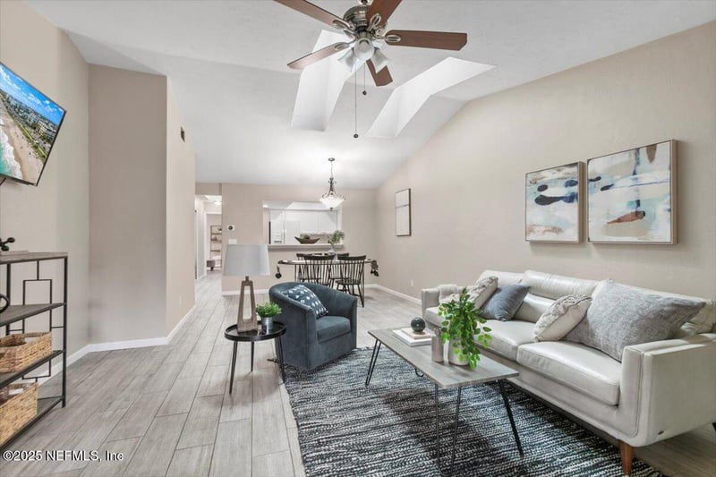 Listing details for 2324 Ironstone Dr, Jacksonville, FL 32246 : Discover this charming 2-bedroom, 2-bath townhome featuring modern updates and a private backyard retreat. Brand new roof and counters, fixtures and floors! Spanning 1,199 square feet, this beautifully maintained home has been freshly painted and boasts brand-new carpeting, offering a clean, contemporary, move-in ready atmosphere. Lawn Care Included! he bright, spacious living area with soaring ceilings creates an inviting sense of openness and warmth. The open-concept design leads into the kitchen, which includes a convenient breakfast bar—with brand new quartz counters! The generous primary suite offers a private en-suite bathroom, while the additional bedroom provide versatile options for a family, guests, or a home office. Both bathrooms are thoughtfully designed for comfort and practicality. Step outside to enjoy your morning coffee or evening relaxation on the fenced backyard patio—an ideal space for outdoor dining, gardening, or simply unwinding in your peaceful outdoor haven.