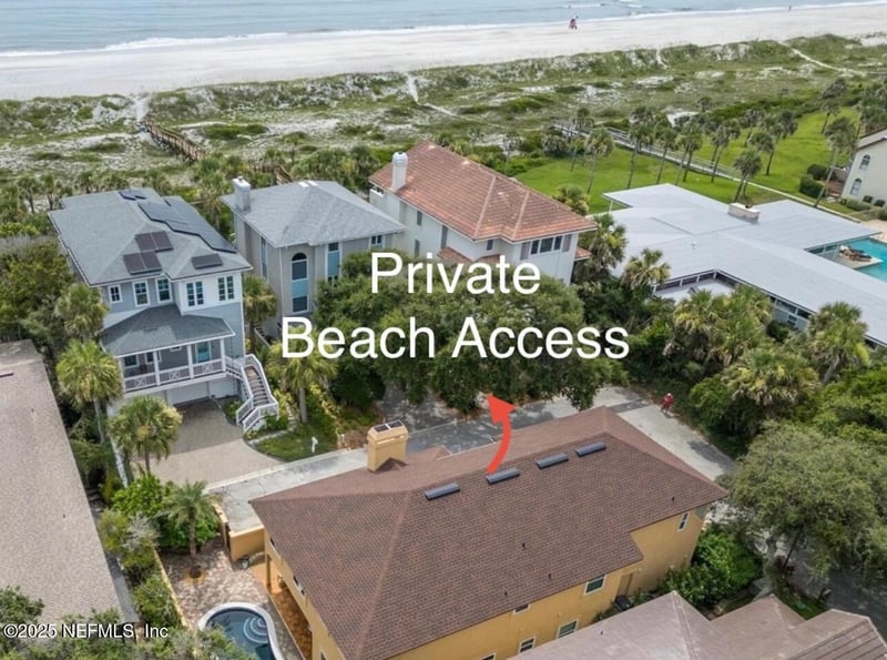 Listing details for 2348 Seminole Reach Ct, Atlantic Beach, FL 32233 : Directly across from private beach access! This home is located on a quiet street that is well protected and buffered from hurricanes. Rare opportunity to own a luxurious coastal escape so close to the beach. This 4BR/3BA unique, updated Beachside home is open and bright with high-end finishes. FEATURES INCLUDE: 20 ft ceiling in great room, beautiful interior archways with curved balcony, large rooms, laundry room upstairs, lots of storage, in-law suite downstairs, oversized garage with workshop space, large bonus room/art studio and a private courtyard with an updated saltwater pool and covered lanai. OTHER UPDATES INCLUDE NEW: exterior paint, roof, AC units, water heater, high-end floors, low-e windows, insulated doors, water softener, garbage disposal, bathroom vanities, travertine in primary bath, pavers on driveway and front walk and Bosch dishwasher.