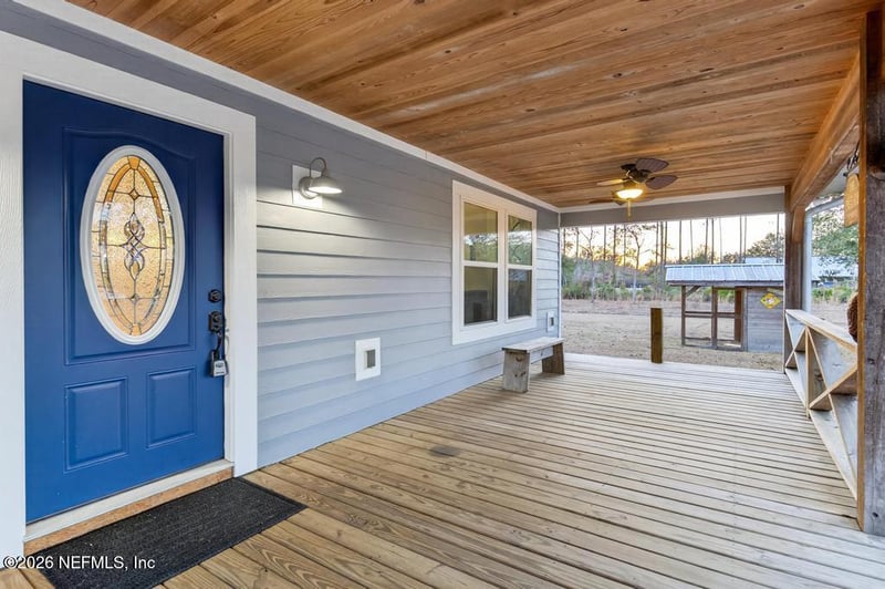 Listing details for 241453 County Road 121, Hilliard, FL 32046 : Country roads, take me home! Tucked away on just under 8 private acres in Hilliard, this property offers the kind of peaceful setting most only dream about. A quiet drive leads you home, opening to wide, covered front and back porches designed for slow mornings with coffee and relaxing evenings surrounded by nature. Inside, sunlight floods the home through an abundance of windows, creating a bright and airy feel throughout the open living spaces. The heart of the home is the stunning floor-to-ceiling stone fireplace, a dramatic focal point that anchors the main living area and makes gatherings feel warm and inviting. The open-concept layout seamlessly connects the living room, dining space, and kitchen, offering both functionality and comfort. The kitchen features crisp white cabinetry, SS appliances, a breakfast bar, pantry, and a flexible island that can be positioned to fit your needs. The spacious primary suite provides a quiet retreat with a large walk-in closet, dual vanities, and a walk-in shower. Storage is thoughtfully incorporated throughout the home, and the oversized laundry room includes space for additional appliances and a utility sink. Outdoor living truly shines here. The expansive screened back porch includes a built-in bar area, ideal for entertaining friends or simply enjoying the serene surroundings. For those needing extra workspace or storage, the property also includes a 26x40 detached two-car garage with power. If you've been searching for privacy, usable acreage, and a home filled with natural light and character, this Hilliard retreat delivers the perfect balance of comfort and country living.