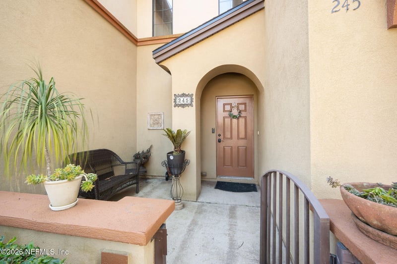 Listing details for 245 Beech Brook St, St Johns, FL 32259 : Welcome home to this beautifully designed Spanish-style townhome located in one of Julington Creek's newest and most convenient areas, offering quick access to major roadways, top shopping, dining, and everyday essentials. This 1,607 sq ft, 3-bedroom, 2.5-bath residence welcomes you through a quiet, private courtyard entry, creating an inviting first impression. Inside, you're greeted by a bright and uplifting two-story entryway that fills the home with natural light. The main living area's open floorplan flows seamlessly into the kitchen and dining space. The kitchen offers crisp white cabinetry, ample storage, and all appliances convey, making this home truly move-in ready. Just off the dining area, enjoy a screened porch—perfect for morning coffee or evening relaxation. Upstairs, you'll find three well-appointed bedrooms, including a comfortable primary suite, all designed for both style and function.
