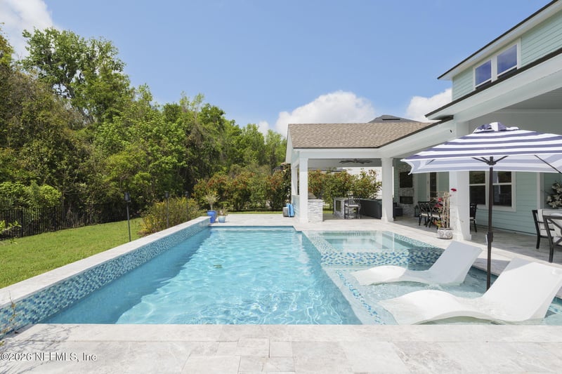 The backyard creates a beautiful outdoor setting designed for Florida living. A heated saltwater pool and oversized spa are surrounded by elegant travertine decking and outdoor living space overlooking the preserve. The extended covered lanai features a summer kitchen with quartz bar seating and a custom outdoor fireplace, creating a space ideal for both entertaining and quiet evenings at home.