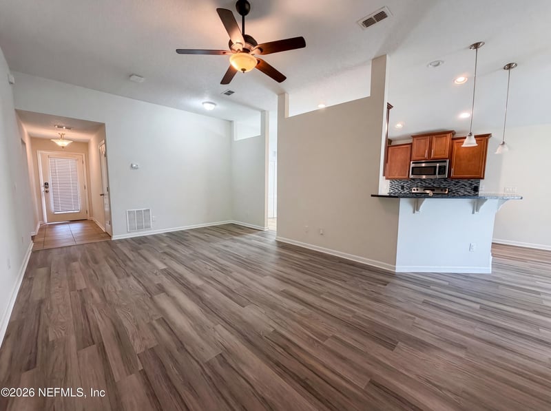 Listing details for 2561 King Louis Dr, Jacksonville, FL 32254 : Discover the expansive layout found at 2561 King Louis Dr that features a modern kitchen equipped with all stainless steel appliances. The layout continues through the interior to the primary bathroom which contains double sinks. The transition from the interior leads to the exterior space where the residence provides a covered patio. This property includes these specific interior and exterior elements.. Included 100-Day Home Warranty with buyer activation