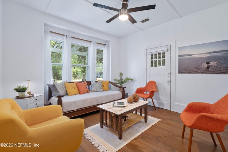 Listing details for 2720 Apache Ave, Jacksonville, FL 32210 : Welcome to this charming 1922 bungalow nestled in the heart of Old Ortega, one of the city's most prestigious neighborhoods. Just a short stroll to the east, the scenic St. Johns River awaits offering mesmerizing sunsets over sparkling waters. This delightful home, with 9ft ceilings blends historic character with modern updates, including new windows that fill the space with natural light.The kitchen and bathroom feature stylish, contemporary finishes, while classic touches like a cozy covered front porch swing invite relaxation.Out back, enjoy evenings around the fire pit or summer BBQs on the private rear porch. A detached 1 car gar. with a spacious workshop sits tucked away in the back corner of the property, ideal for hobbies, storage, or creative projects.The front yard is beautifully framed by mature oak trees, a white picket fence, and sprawling jasmine vines. Low maintenance astro turf provides year round curb appeal with minimal upkeep. It's more than a home, it's a lifestyle! Features and Updates: LVP Flooring 9 Ft Ceilings Astro Turf - front yard Sprinkler System New Windows Metal Roof on Garage Spacious bedrooms Deck on rear Parking in driveway for 7 Cars Walk to parks on the St Johns River
