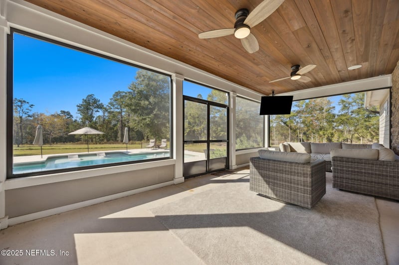 Listing details for 272272 Conner Nelson Rd, Hilliard, FL 32046 : Stunning 2023-built estate on nearly 24 acres with luxury finishes and serene privacy. Completed in August 2023, this 5BR/3.5BA, 2,985 sq ft home blends modern elegance with country charm. The chef's kitchen features quartzite counters, 10' ceilings, floor-to-ceiling cabinetry, oversized island, walk-in pantry, and stainless KitchenAid appliances. Enjoy cozy nights by the soaring stone fireplace or open the 16' glass doors to a screened porch overlooking sunsets and a private pond. The saltwater pool with dual sun shelves is heated/cooled for year-round enjoyment. Durable upgrades include metal roof, Hardie siding, spray foam insulation, and double-paned windows. Extras: 60'x40' pole barn, custom wood shelving, plantation shutters, media close & chicken coop. A rare opportunity for peaceful living with high-end amenities.