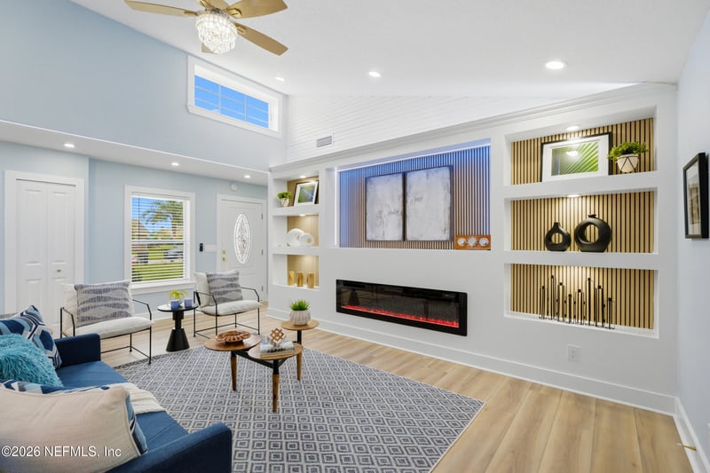 Listing details for 2839 Treasure Cove Ln, Jacksonville, FL 32224 : If you've been searching for a home that's been fully renovated and is truly move-in ready, this is it. Located in the popular Holiday Harbors neighborhood, this 4 bedroom, 2 bath home has been completely updated from top to bottom. The open living area is spacious and bright, with a vaulted ceiling, a built-in electric fireplace, and custom shelving that gives the space a clean, stylish look. The kitchen features a large island with quartz countertops, two-tone cabinets, stainless-steel appliances, and elegant gold pendant lights that tie it all together. There's also a dining area right off the kitchen, so the whole space flows naturally. The bedrooms are comfortable and well sized, each with the same fresh, modern feel throughout. The bathrooms are a real highlight, with marble-look tile, glass-enclosed showers, gold fixtures, and backlit mirrors. Enjoy the enclosed Florida room, ideal for your morning coffee or an afternoon with friends and family. Outside, you've got a covered carport, a nicely sized yard, and fresh landscaping that gives great curb appeal, with plenty of room in the back to park your boat or RV. Castaway Island Preserve is right in your backyard, a short drive to Jax Beach, Providence school, and all the bars and restaurants that San Pablo and Beach Blvd have to offer.